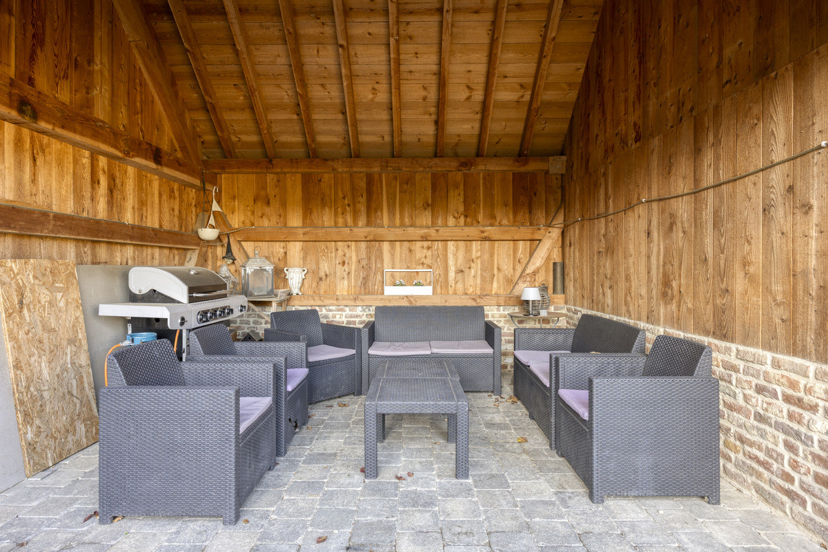- Achteraan de schuur: een tweede koer met overdekt terras waar een gezellige zitruimte is gecreëerd omgeven door het groen