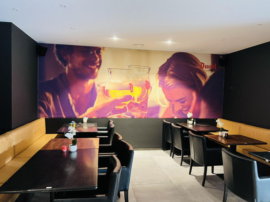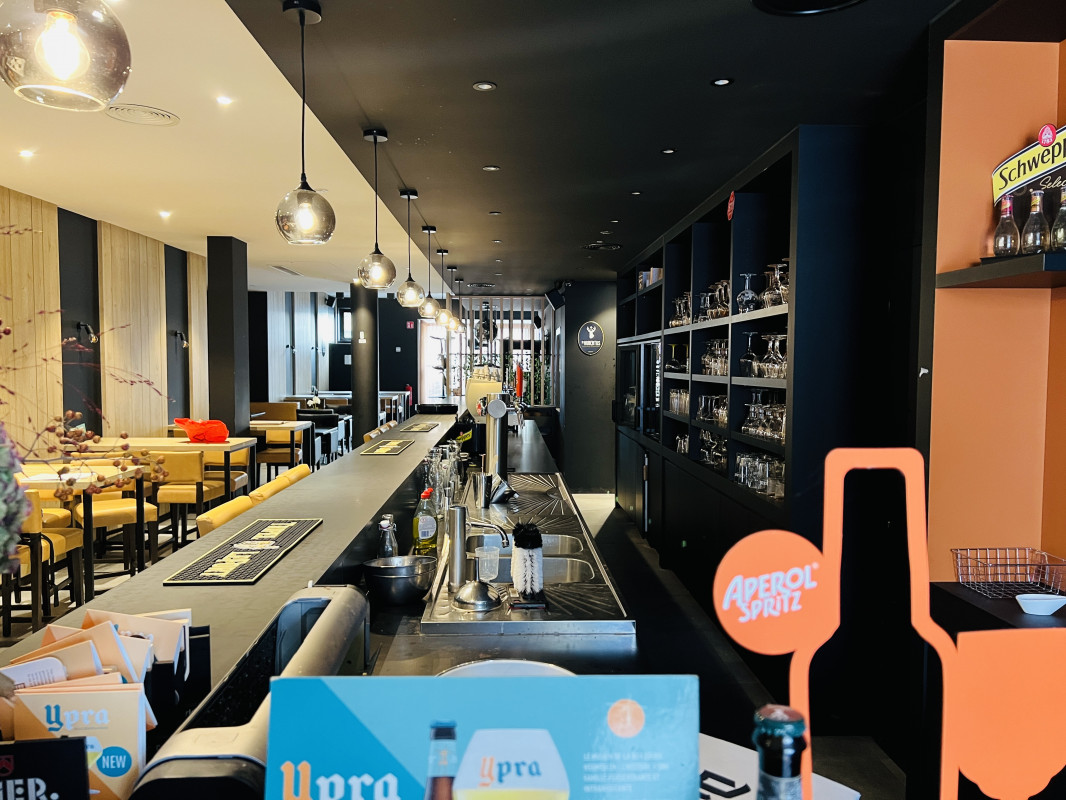 Binnen zijn er circa 80 zitplaatsen. De toog en professionele keuken zijn volledig uitgerust met alle nodige toestellen, voorzien van voldoende koelruimte en functionele werkzones. In de kelder bevinden zich bijkomende opslagruimtes, waaronder twee koelcellen en extra koeling voor efficiënt voorraadbeheer.