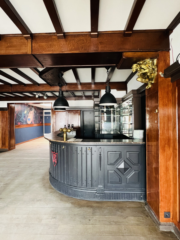 Binnen wacht een verbruiksruimte die meteen indruk maakt: hoge plafonds, authentieke elementen en een sfeer die de grandeur van vroeger perfect weet te bewaren. De bar is volledig ingericht, voorzien van koeling, en biedt samen met het interieur plaats aan zo’n 60 gasten. Verder is er een ingerichte keuken aanwezig, klaar om opnieuw tot leven gewekt te worden.