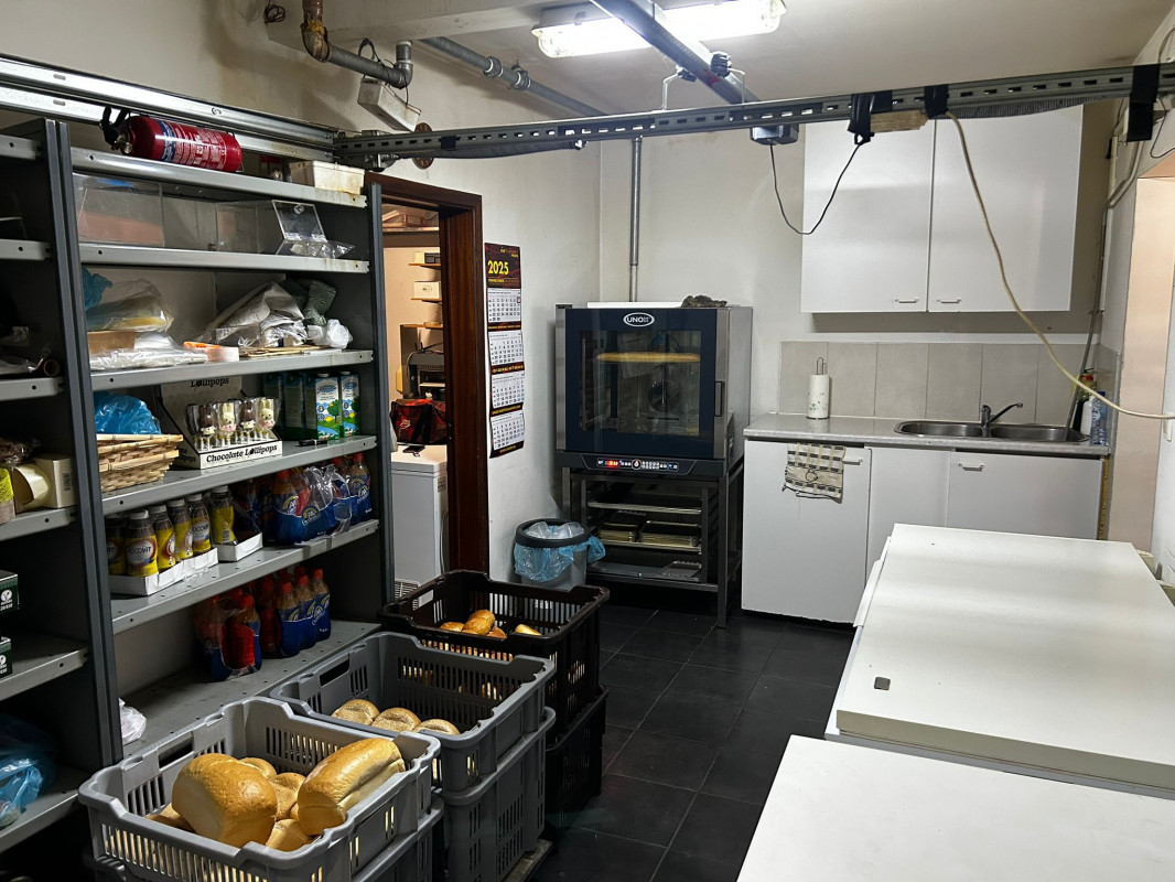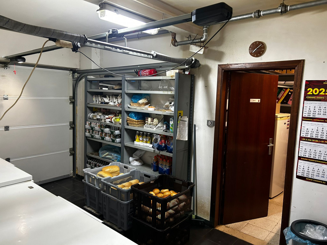 2de deel is de plaats waar de industriele oven staat, leveringen gebeuren, 2 vriezers staan, afwasbak en wat stockage. Deze ruimte is maw ook te betreden van buitenaf via de garage (via deze garage gebeuren de leveringen tevens).