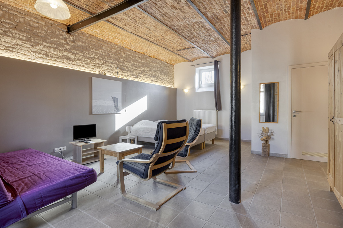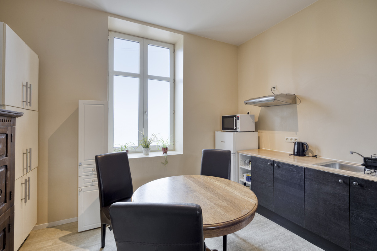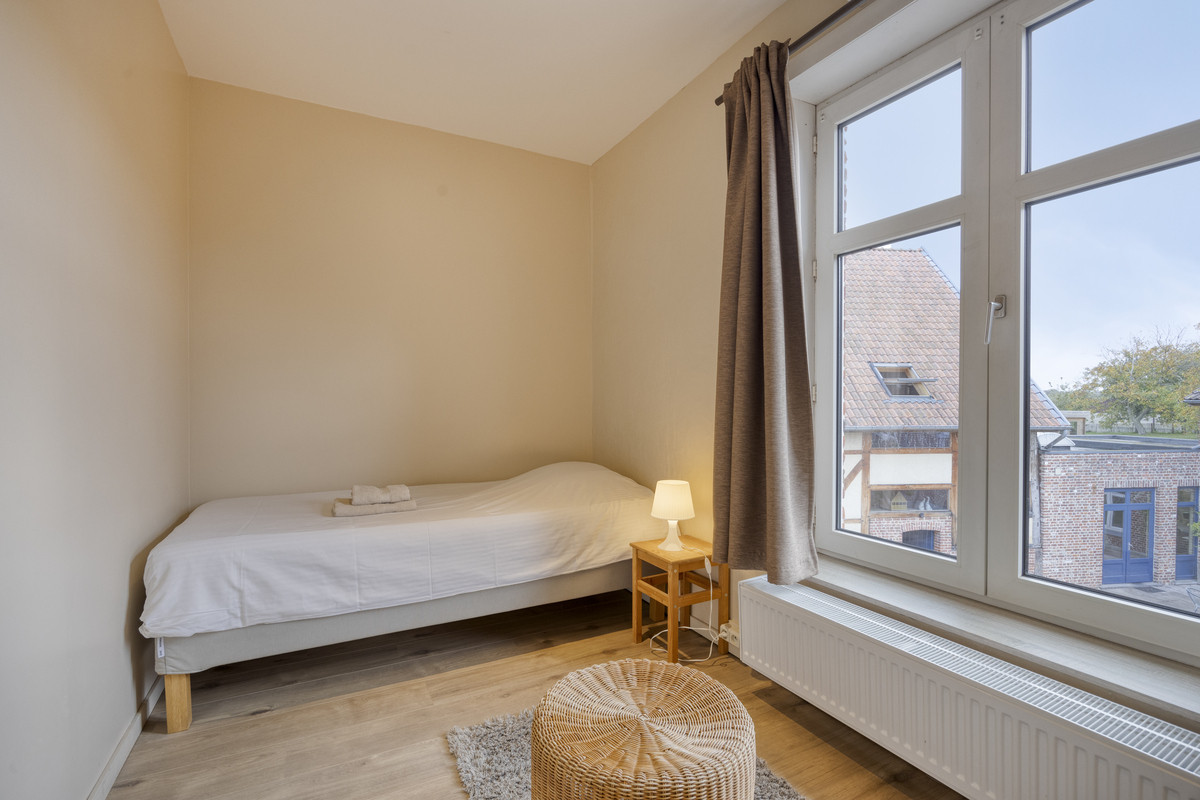 - Lichtinval langs twee kanten door de hoge ramen die vroeger de poorten vormden, met zicht op zowel tuin als binnenkoer