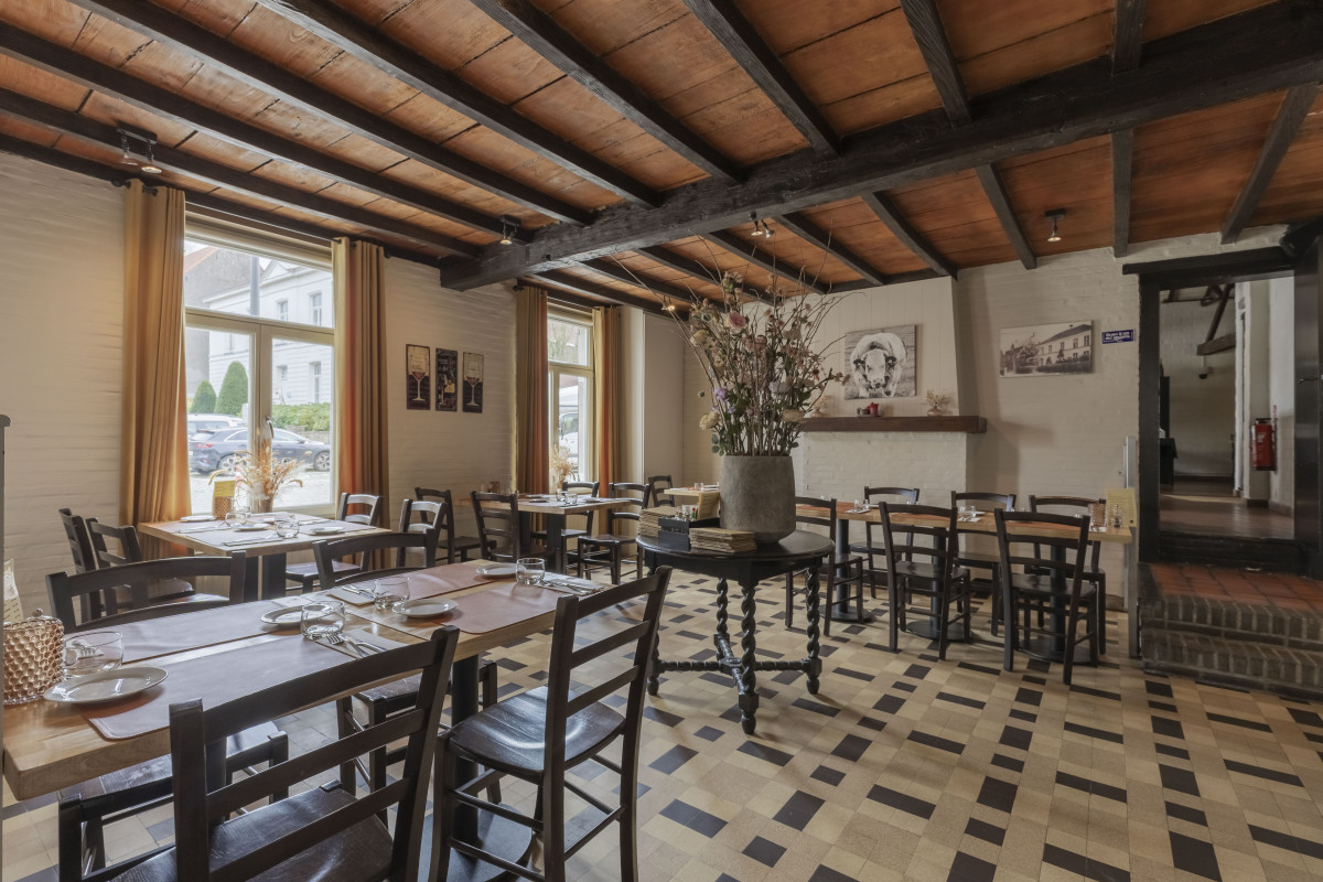 Dit karaktervolle pand kende vroeger een heel andere functie: waar ooit de stal was voor de paarden van cafébezoekers, vindt u vandaag een sfeervolle en volledig vernieuwde bistro. In 2020 onderging het gebouw een grondige renovatie, waarbij het oude feestzaalinterieur plaatsmaakte voor een hedendaagse, warme inrichting die modern aanvoelt zonder kil te zijn.