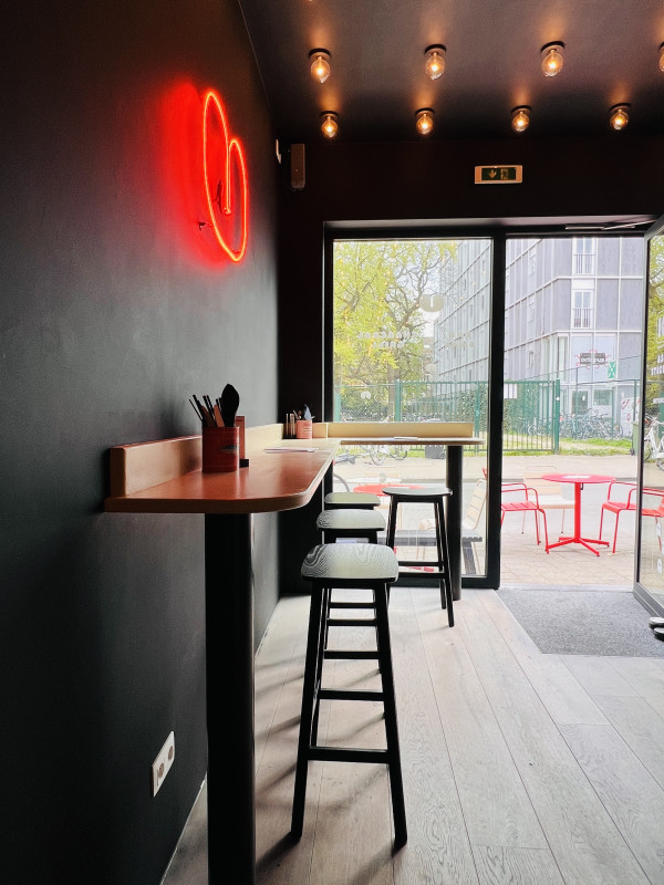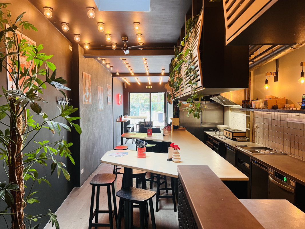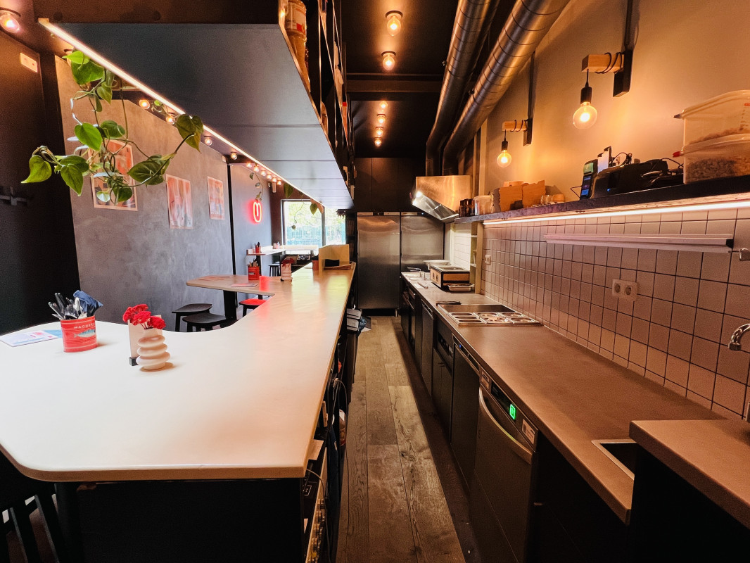 Het interieur is fris, hip en onderscheidt zich duidelijk van de meer traditionele take-away zaken in de buurt, wat meteen een sterke meerwaarde vormt.