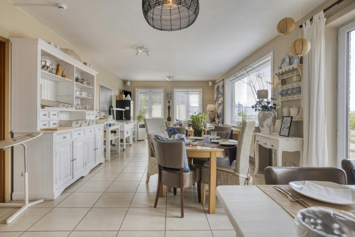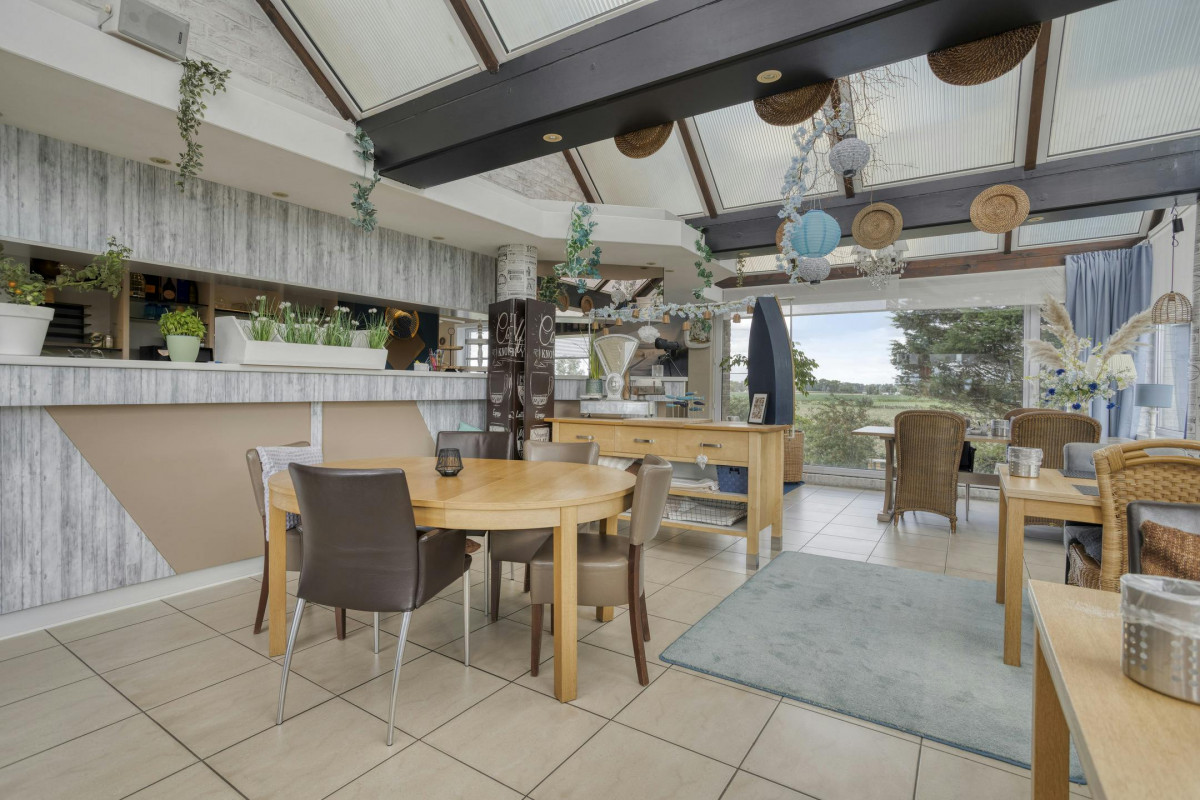Gelijkvloers : onthaal/receptie, ontbijtruimte met keuken en koelkamer, toiletten, 4 tweepersoonskamers met badkamer - terras