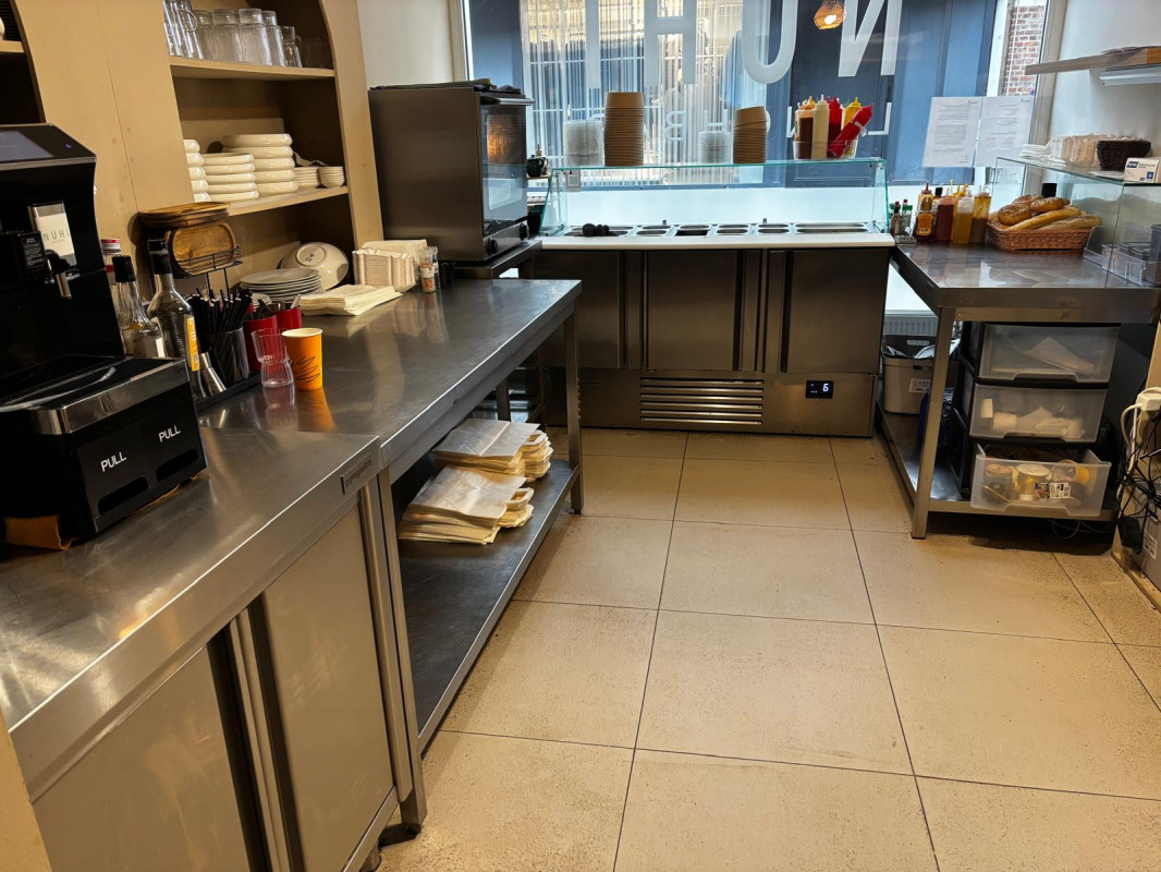 oven, werktafels, volledig automatische koffiemachine en diverse professionele keukentoebehoren.