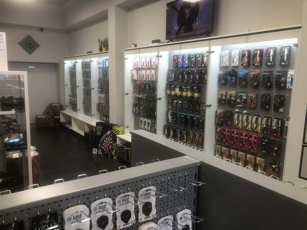 Het gaat over een overname van het handelsfonds. Dwz alle stock die er staat + rekken + kassasysteem. De metalen rekken zijn van tegometal. De kasten voor de pijlen zijn voorzien van glasdeuren en verlichting.