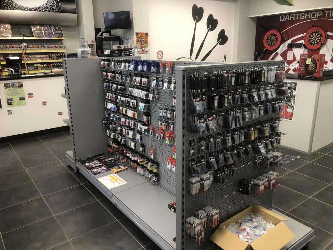 Ruim assortiment aan materiaal = pijlen, borden en alle toebehoren die een darter nodig heeft.